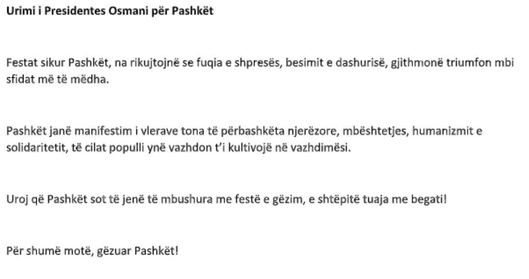 Presidentja e Kosovës, Vjosa Osmani, ka uruar Pashkët. Ajo...