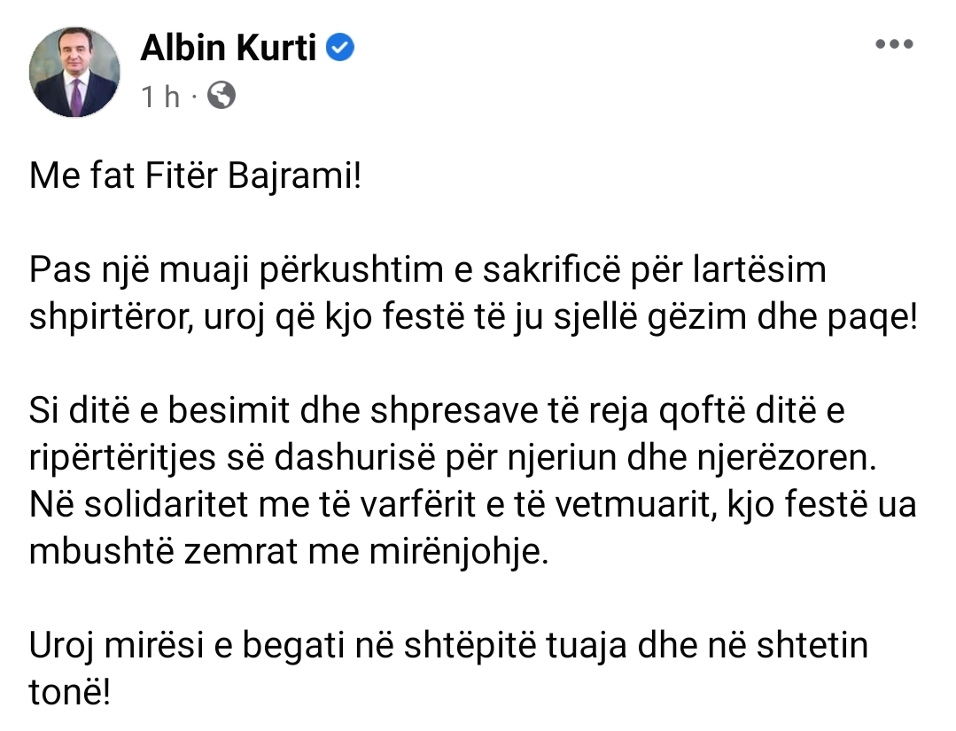 Zëvendëskryeministri i parë, Artan Grubi ka uruar besimtarët e...