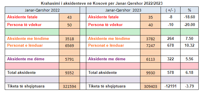Ndërkohë është raportuar që nga janari e deri në qershor, 40 persona kanë humbur jetën në aksidente trafiku, ndërsa mbi 7 mijë qytetarë kanë pësuar lëndime trupore për gjatë kësaj periudhe kohore.