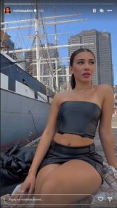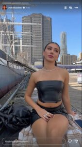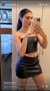 Stili i saj është i veçantë dhe ajo di të pozojë në mënyre perfekte për kamerën.Me një fund të shkurtë të zi lëkure, dhi çizmet e zeza me taka i dhanë një prekje perfekte gjithë pamjes së saj. Zgjedhje klasike me stil që nuk del kurrë nga moda.