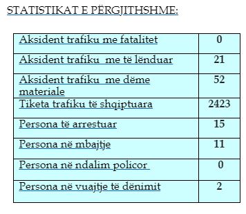 RAJON Mbi dy mijë gjoba trafiku në 24 orët e fundit në Kosovë – Ora Info 06/10/2023 2 mijë e 423 gjoba trafiku janë shqiptuar në 24 orët e fundit në Kosovë. Gjatë kësaj periudhe kanë ndodhue 21 aksidente me të lënduar dhe 52 me dëme materiale. Në 24 orët e fundit janë arrestuar 15 persona dhe 11 janë dërguar në mbajtje./Front Online Continue Reading Previous Previous post: Kovaçevski: Kosova dhe Serbia t’i bëjnë hapat e vërtetë për stabilitet të tërë rajonitNext Next post: Kreu vjedhje të rëndë në Strumicë, arrestohet shkupjani LAJMI FUNDIT Musliu- Shoshi për Kurtin: Historia do ta njohë si lider përçarës i kombit shqiptar 19/11/2024 Sefer Selimi: Nesër në Prishtinë “legjitimohet” degradimi i gjuhës shqipe, flamurit kombëtar, etnisë, diasporës 17/11/2024
