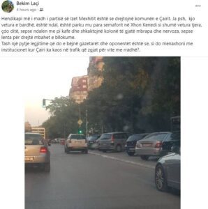 “Hendikapi më i madh i partisë së Izet Mexhitit është se drejtojnë komunën e Çairit. Ja psh, kjo vetura e bardhë, është ndal, është parku mu para semaforit në Xhon Kenedi si shumë vetura tjera, çdo ditë, sepse ndalen me pi kafe dhe shkaktojnë kolonë të gjatë mbrapa dhe nervoza, sepse lenta për drejtë mbahet e bllokume”, ka shkruar Laçi, informon indeks.mk.