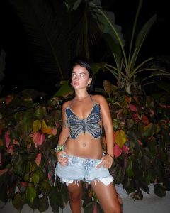“Tropikale”, ka shkruar ajo poshtë këtyre fotografive dhe videove derisa ka pasur të veshur bikine ngjyrë ari.