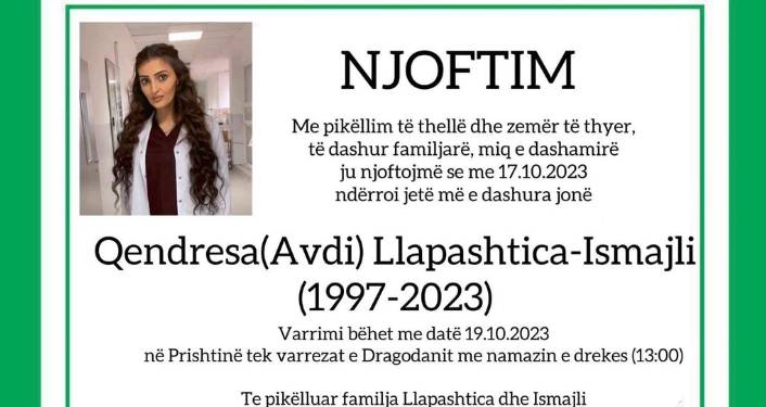“Njoftim, me pikëllim të thellë dhe zemër të thyer, të dashur familjarë, miq e dashamirë ju njoftojmë se me 17.10.2023 ndërroi jetë më e dashura jonë Qendresa Llapshtica-Ismajli. Varrimi bëhet me datë 19.10.2023 në Prishtinë tek varrezat e Dragodanit me namazin e drekes (13:00). Te pikëlluar familja Llapashtica dhe Ismajli”