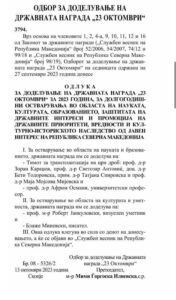 Çmimi “23 Tetori” ndahet për arritje afatgjata në fushën e shkencës, kulturës, arsimit, mbrojtjes së interesave shtetërore dhe promovimit të prioriteteve shtetërore, trashëgimisë kulturore-historike./KlanMacedonia