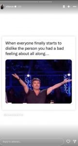 “Kur të gjithë më në fund nisin të mos e pëlqejnë më atë personin për të cilin ti ke pasur gjithnjë një ndjesi të keqe”, ku shfaqet një foto e Simon Coëell me krah hapur.Përplasja e fundit e Arbanës ka qenë me fituesin e “BBVA2”, Luiz Ejllin, gjë që ky i fundit e konfirmoi vetë në një intervistë.