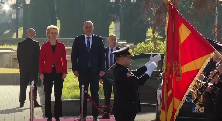 Kryeministri Dimitar Kovaçevski me nderime më të larta shtetërore e priti kryetaren e Komisionit Evropian, Ursula fon der Lajen, e cila është në vizitë zyrtare në shtet.