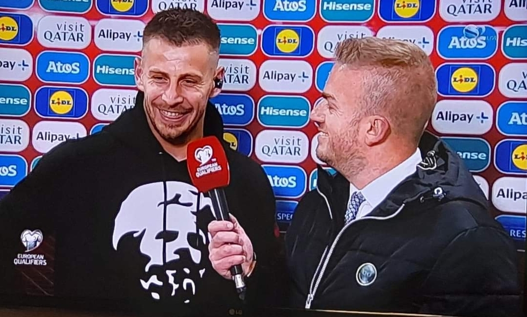 Në intervistën pas ndeshjes për SuperSport, mesfushori u shfaq i veshur me një bluzë në të cilën ishte stampuar portreti i heroit legjendar, Adem Jashari.