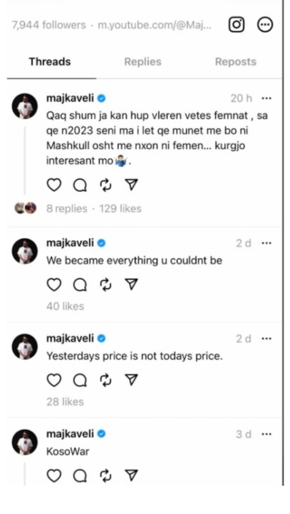 “Qaq shum ja kan hup vlerën vetes femnat, sa qe n2023 seni ma i let qe munet me bo ni Mashkull osht me nxon ni femen…kurgjo interesant mo”, ka shkruar ai në Threads.