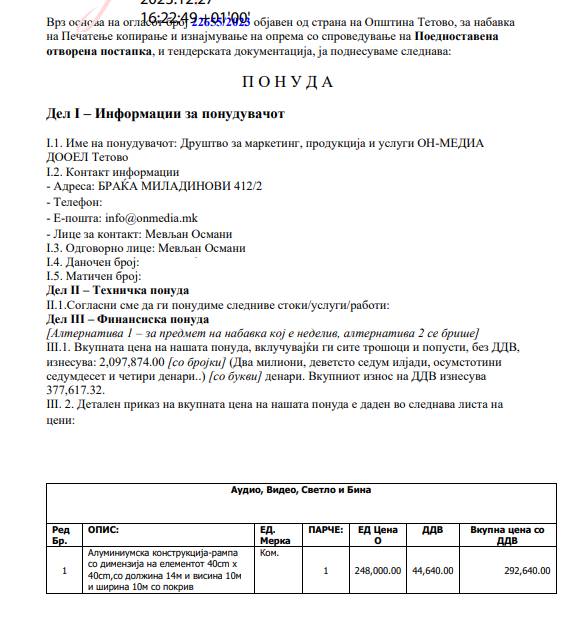 E tenderin e dytë për të cilin edhe po flasim, është bërë së fundmi duke nënshkruar një kontratë me vlerë prej 2.097.874.00 denarë, të cilat nëse i konvertojmë në euro del që për “Botim, kopjim dhe huazim të pajisjeve” Komuna e Tetovës do ti jep kompanisë, “On Media” rreth 35 mijë euro pa përfshirë TVSH-në.