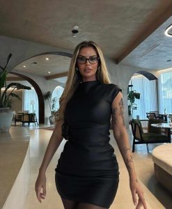 Me një fustan të zi të shkurtër, të kombinuar me një palë syze dhe taka të larta, ajo dukej mahntise.E ajo që bie në sy është se Santiana është mbushur me tatu.