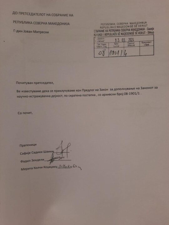 Në dokument shihet se në një komunikim zyrtar mes deputetëve të opozitës dhe kruet të Kuvendit, opozitarët shqiptarë kanë zgjedhur që me Jovan Mitrevskin të komunikojnë vetëm në gjuhën maqedonase, duke mos preferuar mundesinë që ua jep ligji në fuqi të zgjedhurve të popullit, që të komunikojnë në rrugë zyrtare edhe në gjuhën shqipe. https://www.facebook.com/SafijeSadikiShaini.AlternAtivA/posts/798568805627013?