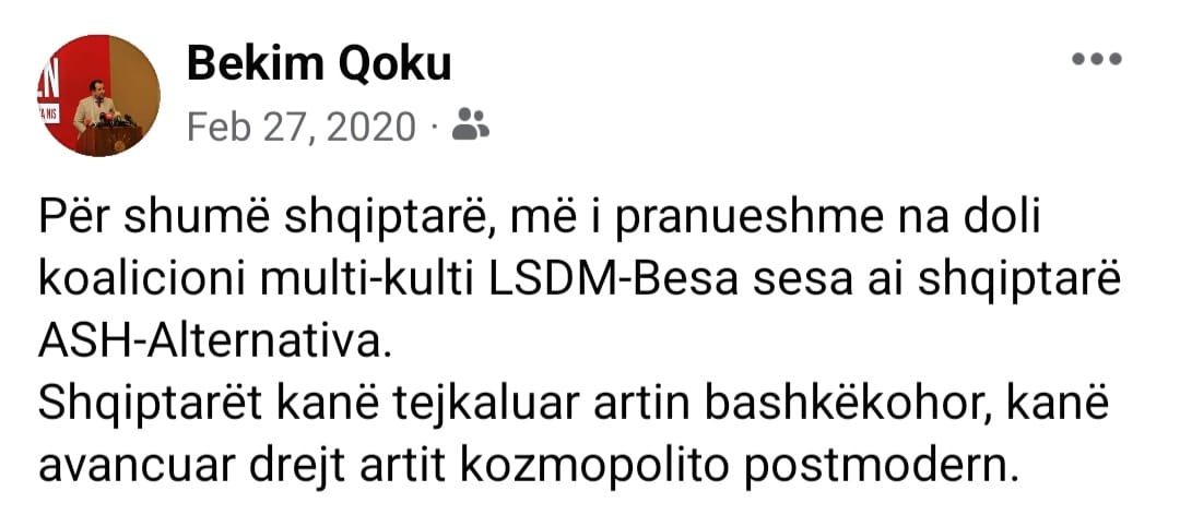 Ai duke komentuar koalicionin mes Besës dhe LSDM, ka shkruar: “Koalicioni LSDM – BESA duhet të bëhet në Muzeun e krimeve sllavo – komuniste dhe LSDM-iste ndaj shqiptarëve, jo në atë të Artit Bashkëkohor”.