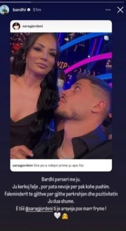 Më herët në Fan Club në Top Channel, Bardhi njoftoi se do hapte Instagram të ri dhe do e publikonte në profilin e Sarës, por kjo gjë nuk ndodhi, pasi mes tij dhe menaxherit mund të jetë rënë një ujdi.Sapo mori në zotërimin e tij, Instagramin, Bardhi i ka bërë Sarës një dedikim zemre, mjaft romantik.