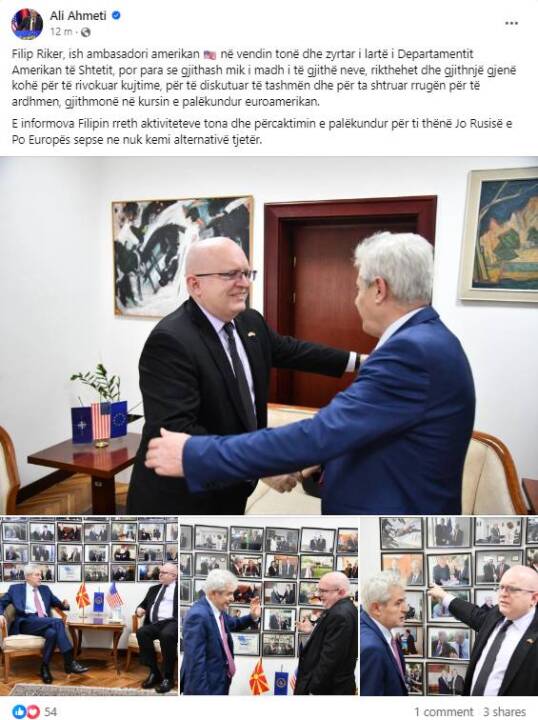 Lideri i Bashkimit Demokratik Integrim Ali Ahmeti, sot është takuar me Filip Riker, ish-ambasadorin amerikan në Shqipëri dhe zyrtar të lartë të Departamentit të Shtetit. Takimi u zhvillua në një atmosferë miqësore, ku u rikujtuan momente të rëndësishme të së kaluarës dhe u diskutuan hapat e ardhshëm në rrugën drejt integrimit euroamerikan.