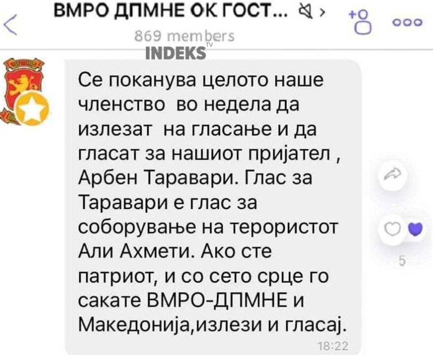 “Ftesë deri tek e gjithë anëtarësia jonë, të dielën të dalim në zgjedhje dhe të votojmë për mikun tonë, Arben Taravari. Vota për Taravarin është votë për mposhtjen e teroristit, Ali Ahmeti. Nëse jeni patriot dhe me zemër e doni VMRO-DPMNE-në, dilni dhe votoni”, thuhet në porosinë e dërguar në grupën e Viber të VMRO-së në Gostivar./indeks.mk/