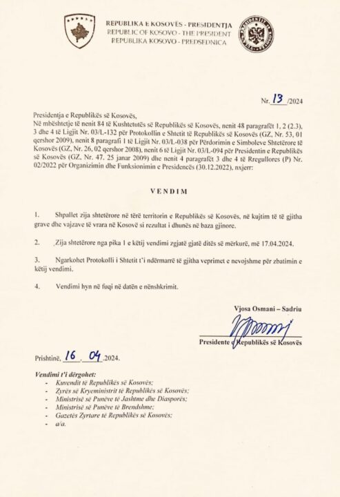 Presidentja e Kosovës, Vjosa Osmani ka shpallur të mërkurën ditë zie shtetërore në Kosovë, pas vrasjes në Pejë, e dyta kjo brenda një kohe të shkurtër. Pas vrasjes së Erona Coklit në Ferizaj nga ish-bashkëshorti, një tjetër rast makabër ka ndodhur sot në orët e hershme të mëngjesit në Pejë. Gjyljeta Ukella nga Peja dyshohet se u vra nga bashkëshorti i saj.
