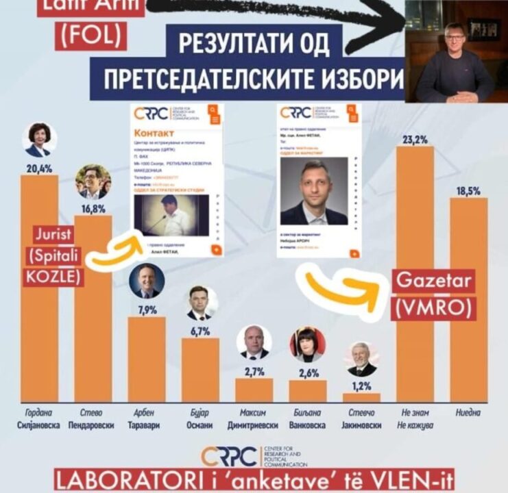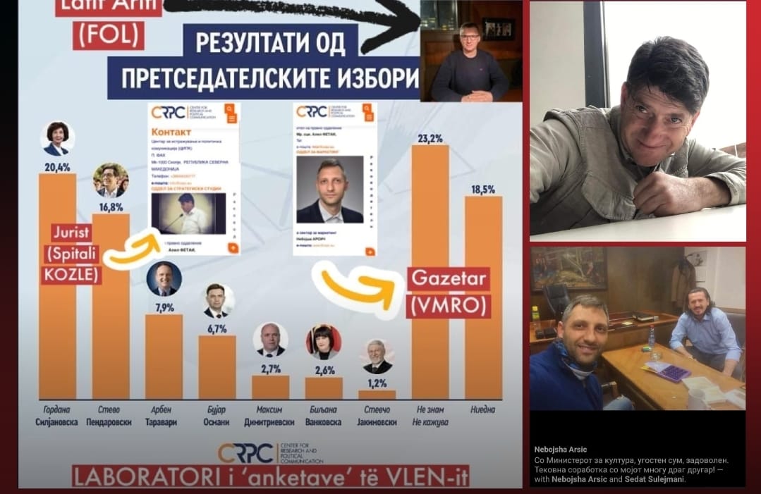 Kryesuesi i “institutit anketues” CRPC figuron të jetë, Alil Fetai, njeri i afërt i Taravarit dhe trumpetues i fushatës së të njejtit në rrjete sociale, teksa për bashkëpunëtor të ngushtë ka Nebojsha Arsiç, gazetari i afërt me VMRO-DPMNE-në dhe Lëvizjen Besa.