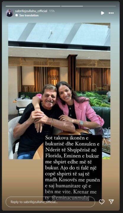 “Sot takova ikonën e bukurisë dhe Konsulen e Nderit të Shqipërisë në Florida, Eminën e bukur me shpirt edhe më të bukur. Ajo do t’i falë një copë shpirti të saj të madh Kosovës me punën e saj humanitare që e bën me vite. Krenar me ty @eminacunmulaj”, shkroi ai./Indeksonline/