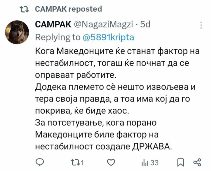Është partneri i koalicionit të VMRO-së në Qeverinë e re, Petar Bogoevski nga Lëvizja “Koncepti Maqedonas” që për çdo ditë ofendon dhe fyen shqiptarët. Pothuajse në secilin postim i njëjti përdorë shprehjen fyese “shqiptari”.