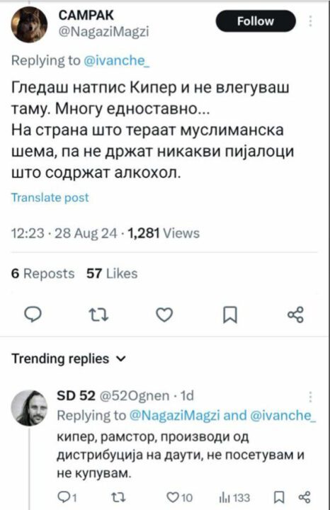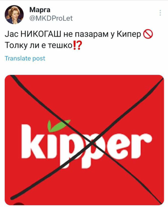 “Shiptari”, “Pleme”, “Kafshë”… janë etiketimet që këto faqe dhe persona i quajnë shqiptarët e Maqedonisë, ndërsa kërkohet që marketet dhe kompanitë si “Kiper”, “Dauti Komerc” dhe të tjerët me pronarë dhe kapital shqiptarë, të mos vizitohen dhe të mos bëhet pazare në to. Kjo, sepse siç thuhet në thirrjet e shtuara këto ditë, në to flitet “shiptarski jazik” (gjuhë shqipe) dhe se janë te besimit fetar islam, shkruan gazeta KOHA.“Thjeshtë bojkoto, mos u fut në Kiper. E sheh emrin ‘Kiper’ dhe mos u fut. Është shumë e thjeshtë. Të mos flasim pastaj që, përveç që flitet shqip, janë edhe muslimanë dhe nuk mbajnë asnjë lloj alkooli apo mish derri”, shkruan një profil me emrin “Samrak” e që mbështet politikat e VMRO-së.
