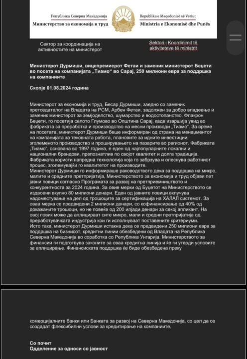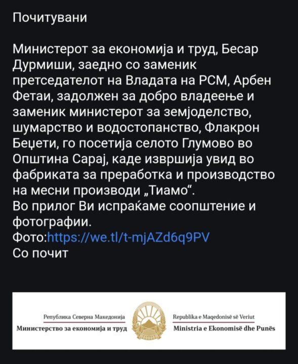 Kjo u dëshmua edhe në njoftimin e fundit për media të shpërndarë nga Ministria e Ekonomisë dhe Punës, ku flitej për vizitën e fundit që Durmishi s’bashku me Arben Fetain dhe Flakron Bexhetin kishin kryer në kompaninë “Tiamo” në Gllumovë të Sarajit.