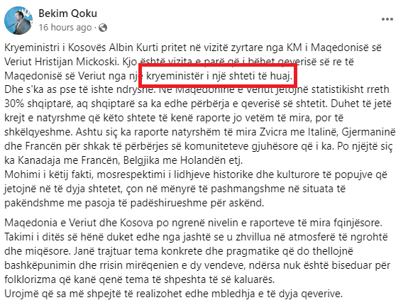 “Shteti i huaj”, kështu është Kosova për deputetin e Vetëvendosjes në Maqedoni, Bekim Qokun që duke folur për vizitën e kryeministrit Albin Kurti në Maqedoni, tha se kjo ështe vizita e parë që i bëhet vendit nga “një shtet i huaj”, që ka formimi i Qeverisë së re.