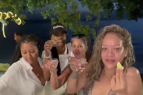 Në një moment, katër zonjat pozojnë për një fotografi, përpara se Rihanna t’u kërkojë të gjithëve të vendosin gotat në ajër për një dolli, ndërsa një punëtore vazhdon të filmojë festimet.