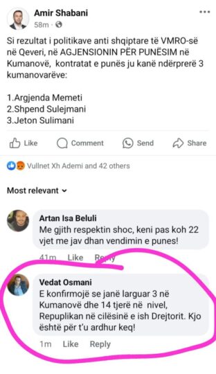 Gjithashtu, njoftimin për largimin nga puna të 3 të punësuarve nga Agjencioni për punësim e ka konfirmuar edhe ish-drejtori i Agjencionit për punësim, Vedat Osmani duke njoftuar edhe për largimin e 14 të tjerëve në nivel republikan.