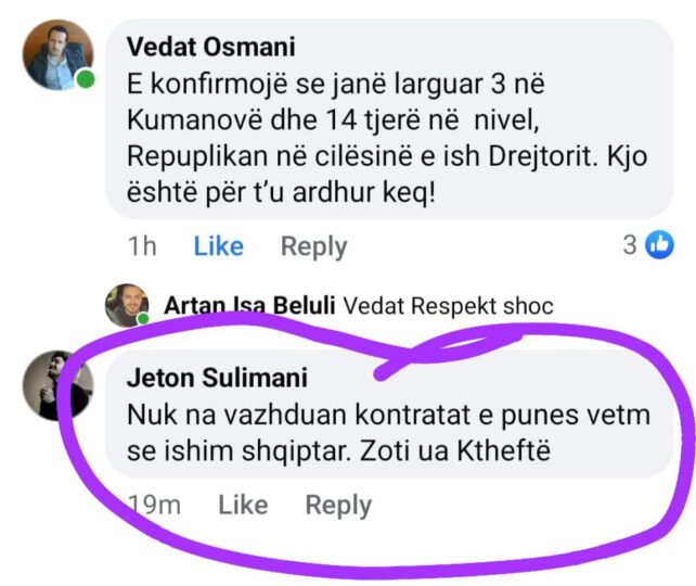 Në një postim në fejsbuk ku ka njoftuar për të njejtit Ish-drejtori i Fondit të Depozitave, Amir Shabani, i menjëhershëm ka qenë edhe reagimi i të larguarve nga puna, të cilët kanë pohuar se janë larguar nga vendi i punës vetëm për faktin se janë shqiptarë.