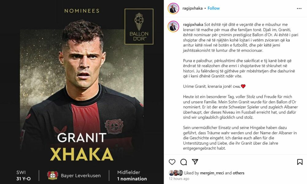 “Sot është një ditë e veçantë dhe e mbushur me krenari të madhe për mua dhe familjen tonë. Djali im, Graniti, është nominuar për çmimin prestigjioz Ballon d’Or. Ai është i pari shqiptar dhe në të njëjtën kohë lojtari i vetëm zviceran që ka arritur këtë nivel në botën e futbollit, dhe për këtë jemi jashtëzakonisht të lumtur dhe të emocionuar”, shkroi Xhaka senior.