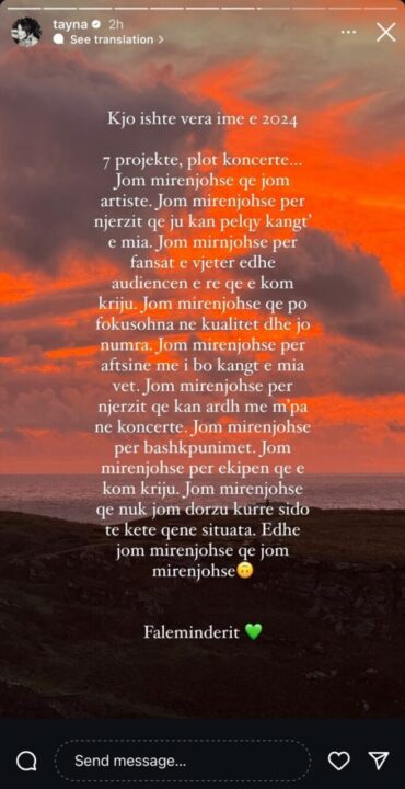 “Jam mirënjohëse që jam artiste. Jam mirënjohëse për njerëzit që ju kanë pëlqyer këngët e mia. Jam mirënjohëse për fansat e vjetër dhe audiencën e re që e kam krijuar”, shkruan Tayna në postimin e saj.