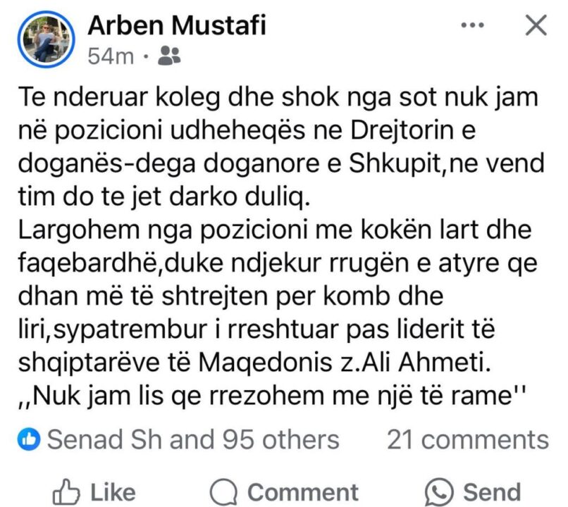 Arben Mustafi, vëllai i dëshmorit Avdi Mustafa, është zëvendësuar nga pozicioni drejtues në Drejtorinë Doganore të Shkupit me Darko Duliq.